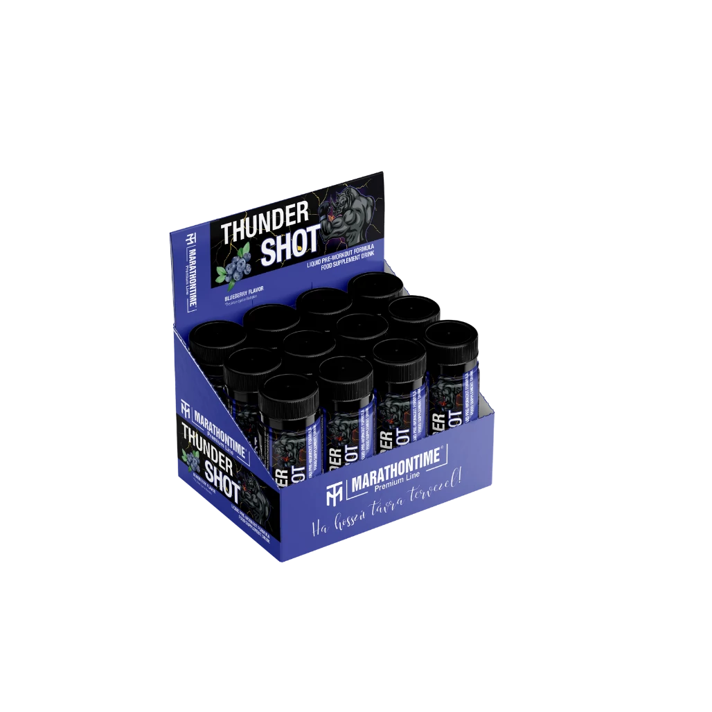 The Thunder Shot is a blueberry flavored pre-workout food supplement drink with citrulline malate, L-arginine alpha-ketoglutarate, taurine, beta-alanine, caffeine, L-theanine and vitamins. Vitamin B3, B6 and B12 contribute to normal energy-yielding metabolism and the reduction of tiredness and fatigue. 60 ml ampoule, 2 servings – ready-to-drink, no mixing required, just shake and consume.